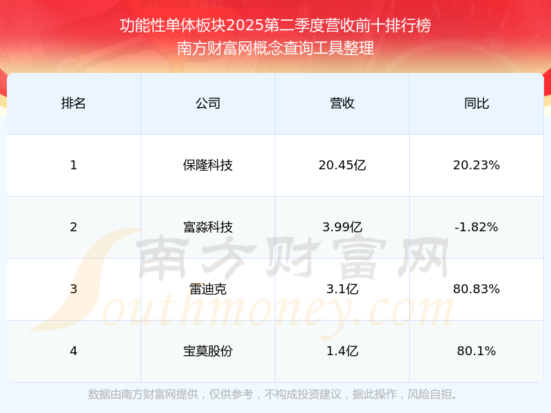 按照南方財富網(wǎng)概念查詢工具統(tǒng)計,該股所屬板塊為功能性單體板塊,該板塊共有4只股票,富淼科技2025第二季度營收在該板塊中排名為第2名,該板塊2025第二季度營收排名前十的股票如下表: