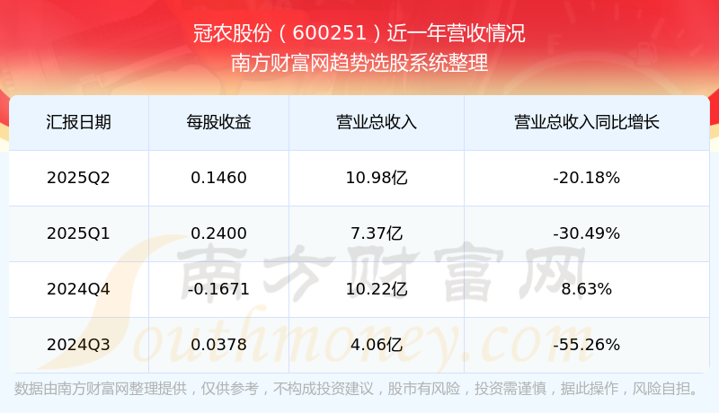 冠農(nóng)股份(600251)發(fā)布2025年第二季度財報。2025年第二季度冠農(nóng)股份實現(xiàn)營業(yè)收入10.98億元,同比增加-20.18元%,環(huán)比增加49.03%;凈利潤為1.15億元,同比增長93.37%,環(huán)比增長-38.05%。