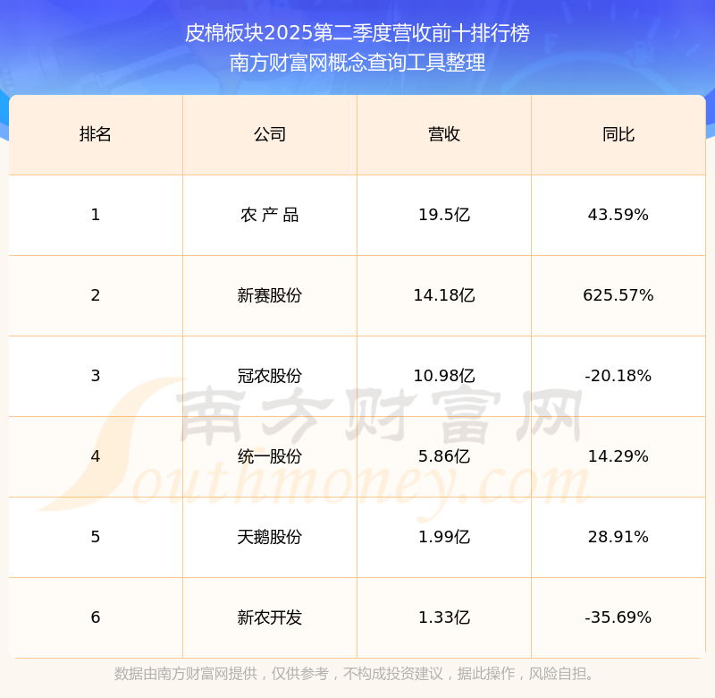 按照南方財富網(wǎng)概念查詢工具統(tǒng)計,該股所屬板塊為皮棉板塊,該板塊共有6只股票,冠農(nóng)股份2025第二季度營收在該板塊中排名為第3名,該板塊2025第二季度營收排名前十的股票如下表: