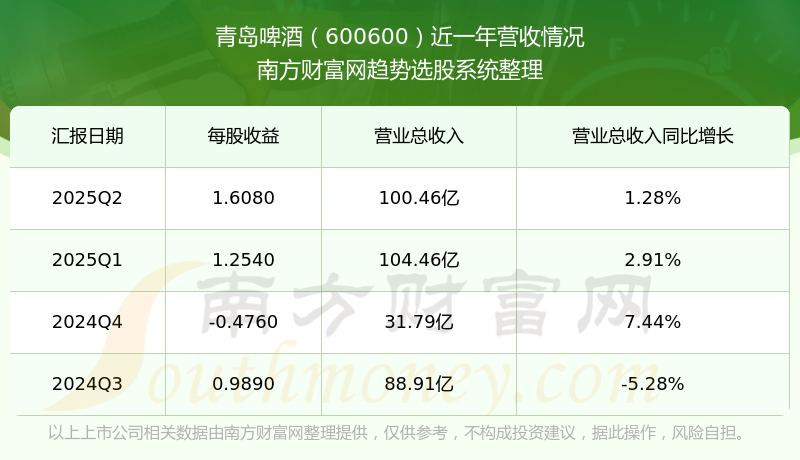 青島啤酒2025年第二季度公司實(shí)現(xiàn)營業(yè)收入100.46億元,同比1.28%;歸母凈利潤21.94億元,同比7.32%。