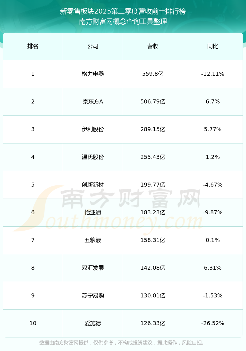 按照南方財(cái)富網(wǎng)概念查詢工具統(tǒng)計(jì),該股所屬板塊為新零售板塊,該板塊共有206只股票,青島啤酒2025第二季度營收在該板塊中排名為第17名,該板塊2025第二季度營收排名前十的股票如下表: