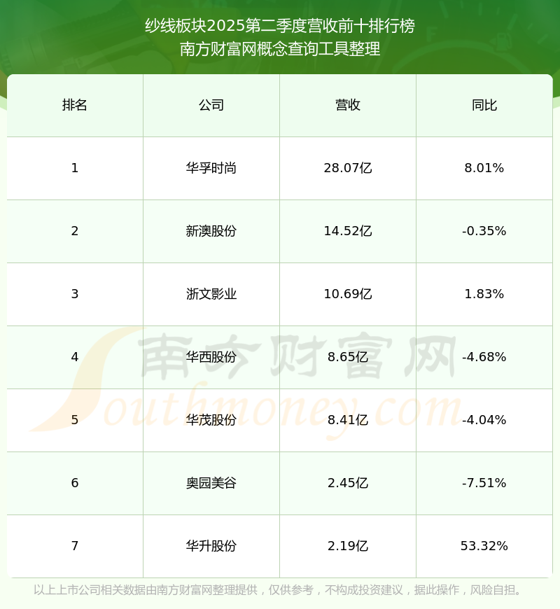 按照南方財(cái)富網(wǎng)概念查詢工具統(tǒng)計(jì),該股所屬板塊為紗線板塊,該板塊共有7只股票,百隆東方2025第二季度營收在該板塊中排名為第7名,該板塊2025第二季度營收排名前十的股票如下表: