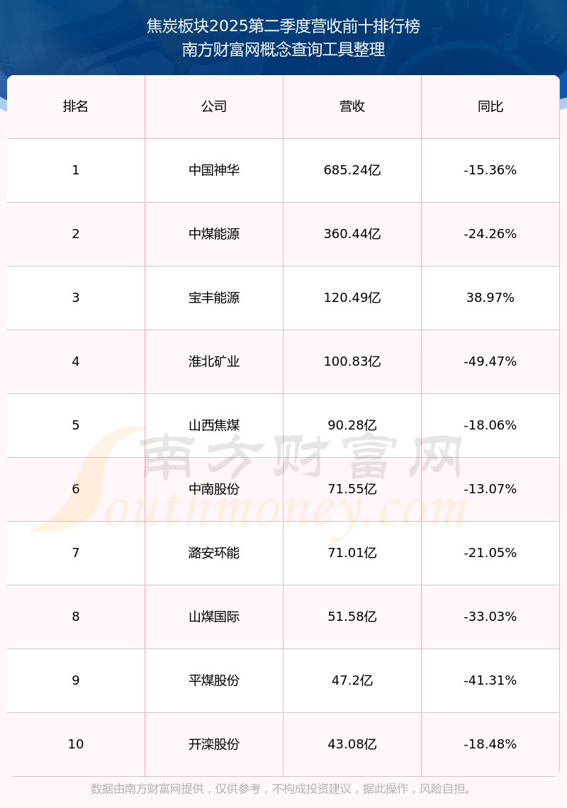 按照南方財(cái)富網(wǎng)概念查詢工具統(tǒng)計(jì),該股所屬板塊為焦炭板塊,該板塊共有22只股票,云煤能源2025第二季度營(yíng)收在該板塊中排名為第17名,該板塊2025第二季度營(yíng)收排名前十的股票如下表: