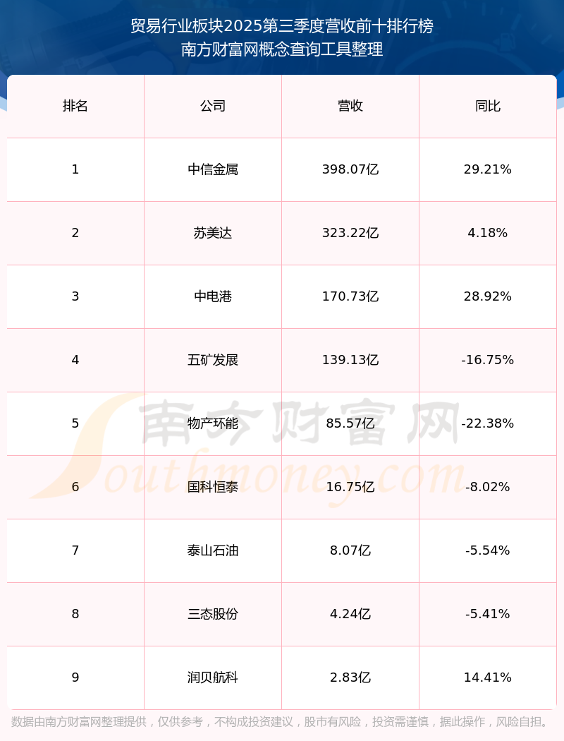 按照南方財(cái)富網(wǎng)概念查詢工具統(tǒng)計(jì),該股所屬板塊為貿(mào)易行業(yè)板塊,該板塊共有9只股票,廊坊發(fā)展2025第三季度營(yíng)收在該板塊中排名為第9名,該板塊2025第三季度營(yíng)收排名前十的股票如下表: