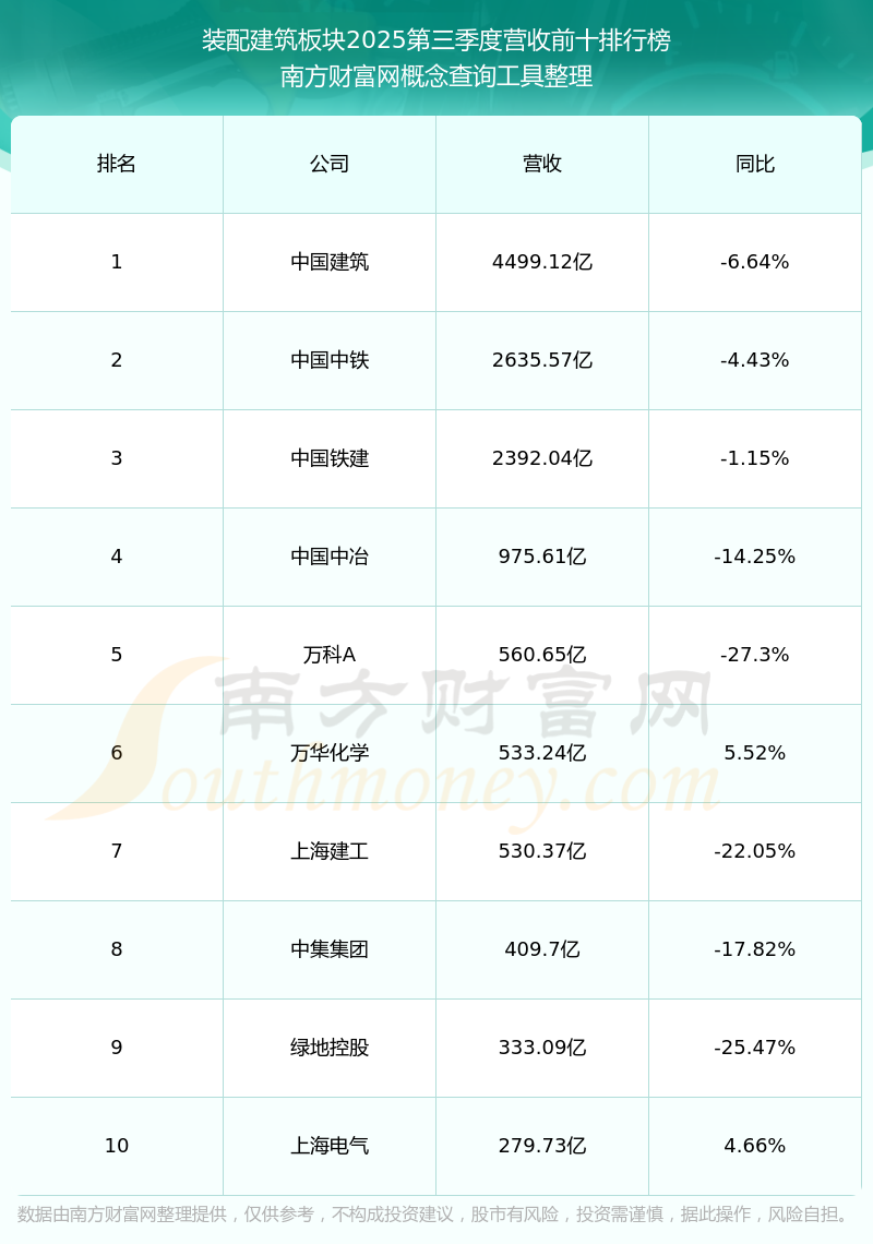 按照南方財(cái)富網(wǎng)概念查詢工具統(tǒng)計(jì),該股所屬板塊為裝配建筑板塊,該板塊共有92只股票,中國(guó)中冶2025第三季度營(yíng)收在該板塊中排名為第4名,該板塊2025第三季度營(yíng)收排名前十的股票如下表: