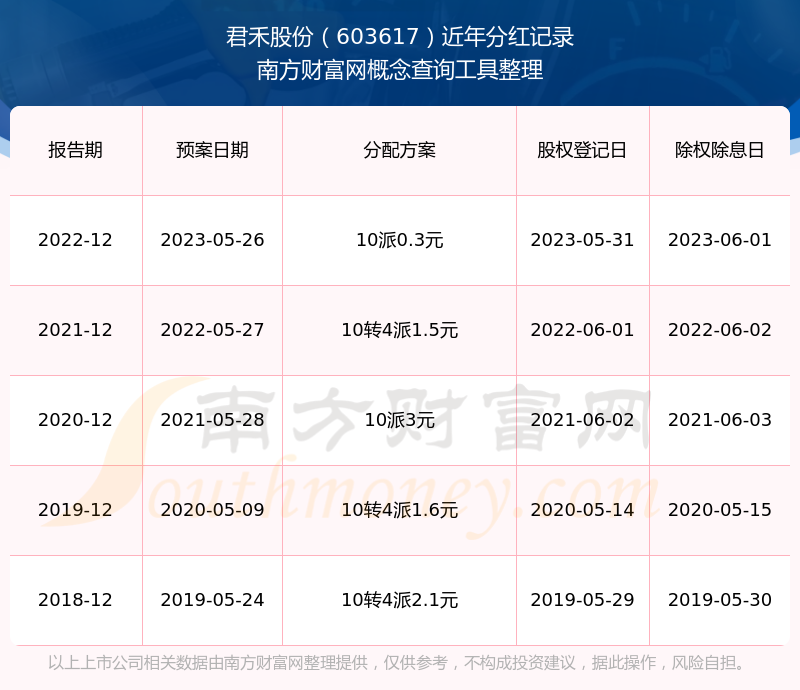 君禾股份最新一次公布的分紅方案為10派0.3元。本次權(quán)益分派股權(quán)登記日為2023年5月31日,除權(quán)除息日為2023年6月1日,派息日為2023年6月1日。
