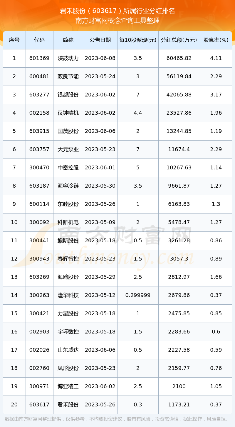 按照南方財富網(wǎng)趨勢選股系統(tǒng)統(tǒng)計,君禾股份所屬行業(yè)為泵行業(yè),泵行業(yè)分紅排名情況如下表: