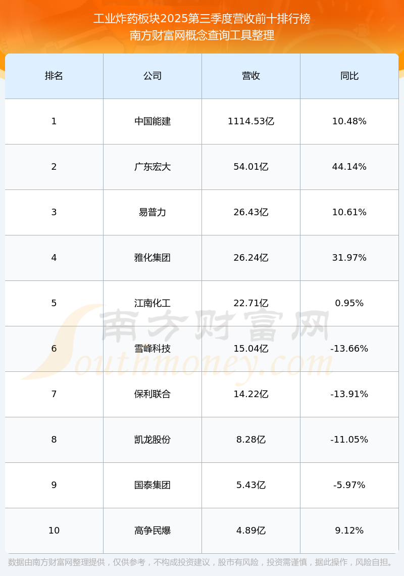 按照南方財富網(wǎng)概念查詢工具統(tǒng)計,該股所屬板塊為工業(yè)炸藥板塊,該板塊共有13只股票,國泰集團2025第三季度營收在該板塊中排名為第9名,該板塊2025第三季度營收排名前十的股票如下表: