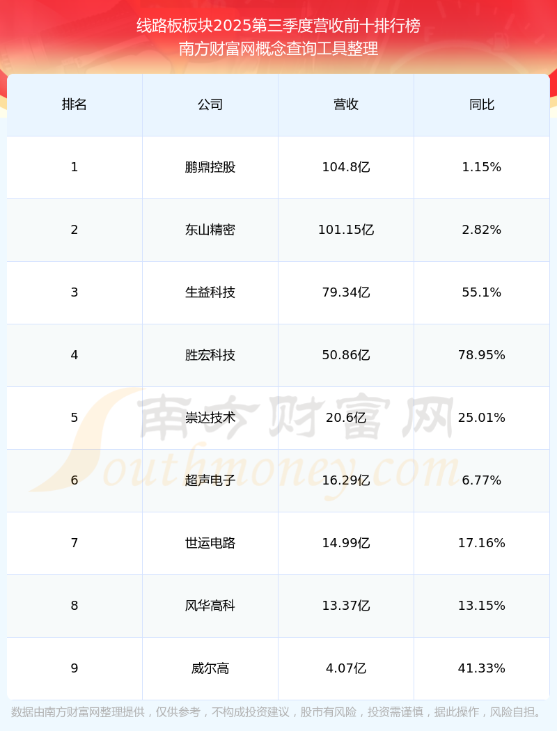 按照南方財富網(wǎng)概念查詢工具統(tǒng)計,該股所屬板塊為線路板板塊,該板塊共有9只股票,世運電路2025第三季度營收在該板塊中排名為第7名,該板塊2025第三季度營收排名前十的股票如下表: