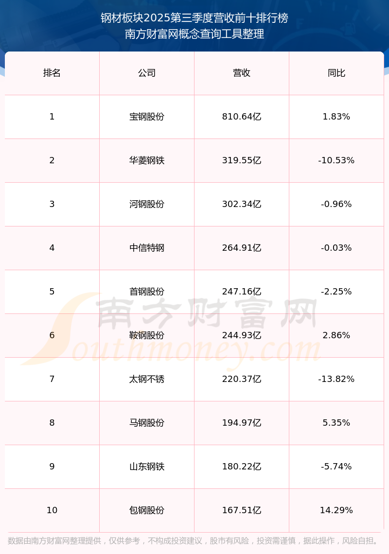按照南方財(cái)富網(wǎng)概念查詢工具統(tǒng)計(jì),該股所屬板塊為鋼材板塊,該板塊共有30只股票,安陽(yáng)鋼鐵2025第三季度營(yíng)收在該板塊中排名為第17名,該板塊2025第三季度營(yíng)收排名前十的股票如下表: