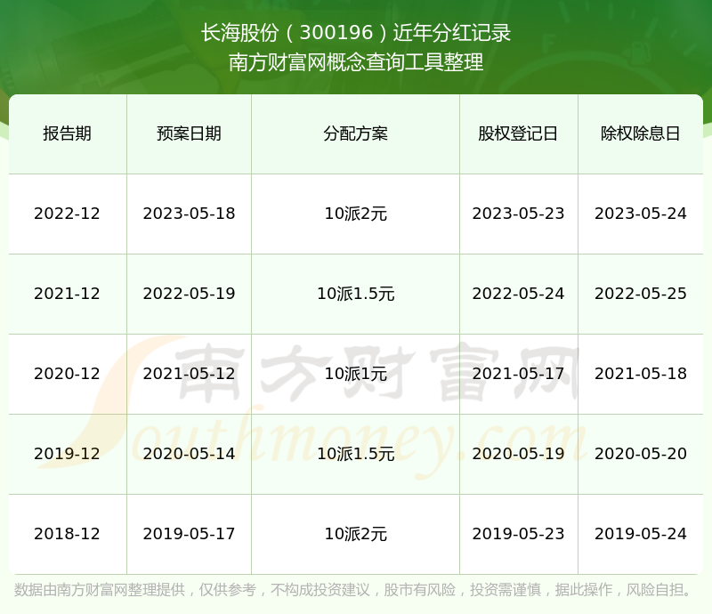 長海股份最新一次公布的分紅方案為10派2元。本次權益分派股權登記日為2023年5月23日,除權除息日為2023年5月24日,派息日為2023年5月24日。