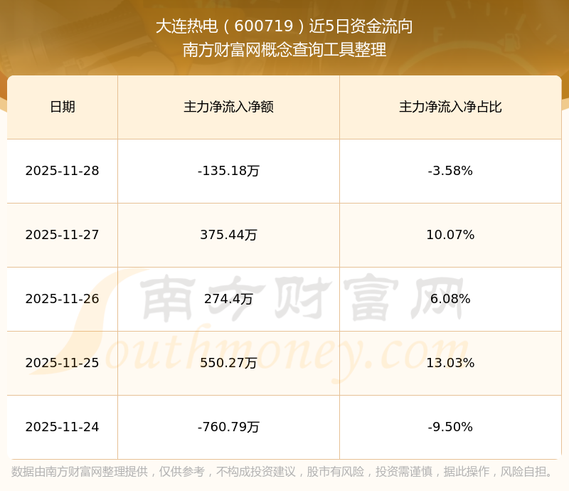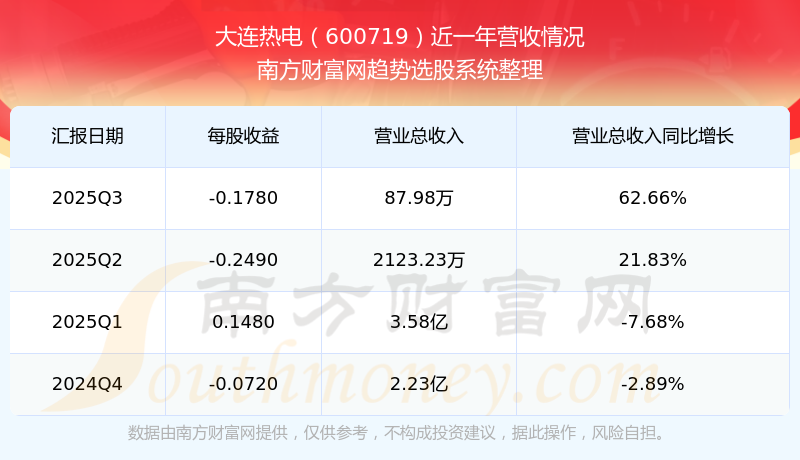 大連熱電2025年第三季度顯示,公司主營收入87.98萬元,同比62.66%;歸母凈利潤-7188.33萬元,同比4.19%;扣非凈利潤-7229.73萬元,同比4.52%;