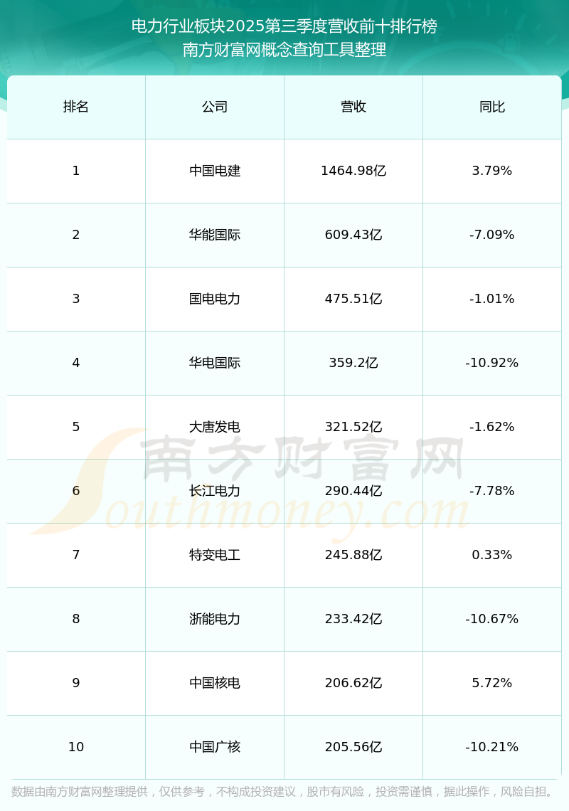 按照南方財富網(wǎng)概念查詢工具統(tǒng)計,該股所屬板塊為電力行業(yè)板塊,該板塊共有93只股票,大連熱電2025第三季度營收在該板塊中排名為第93名,該板塊2025第三季度營收排名前十的股票如下表: