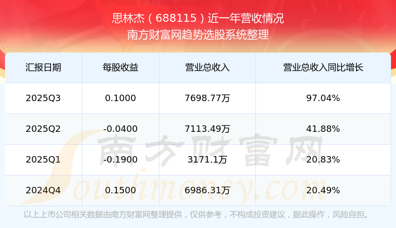 于2025年第三季度,思林杰披露了其業(yè)績表現(xiàn),其中主營業(yè)務(wù)收入7698.77萬元,相較于去年同期97.04%。此外,公司歸屬于母公司的凈利潤為652.5萬元,同比增長了310.89%。在扣除所有非經(jīng)常性損益后,凈利潤574.15萬元,同比增長225.24%。