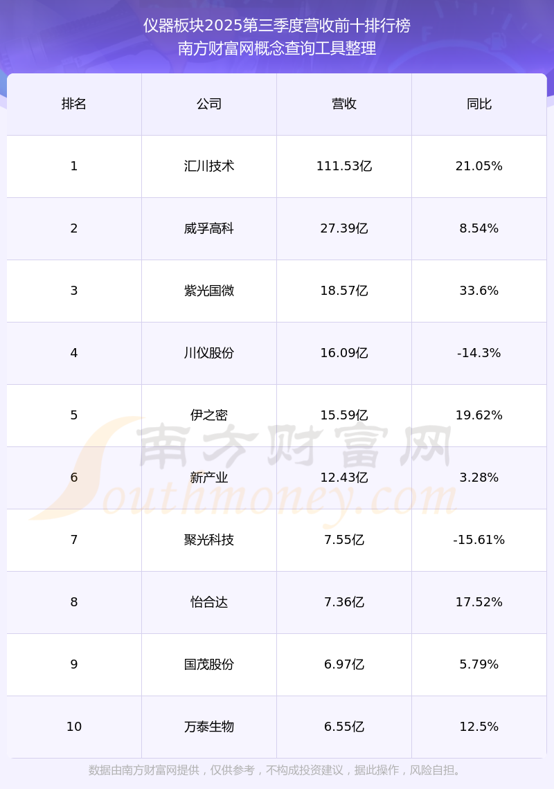 按照南方財富網(wǎng)概念查詢工具統(tǒng)計,該股所屬板塊為儀器板塊,該板塊共有24只股票,思林杰2025第三季度營收在該板塊中排名為第24名,該板塊2025第三季度營收排名前十的股票如下表: