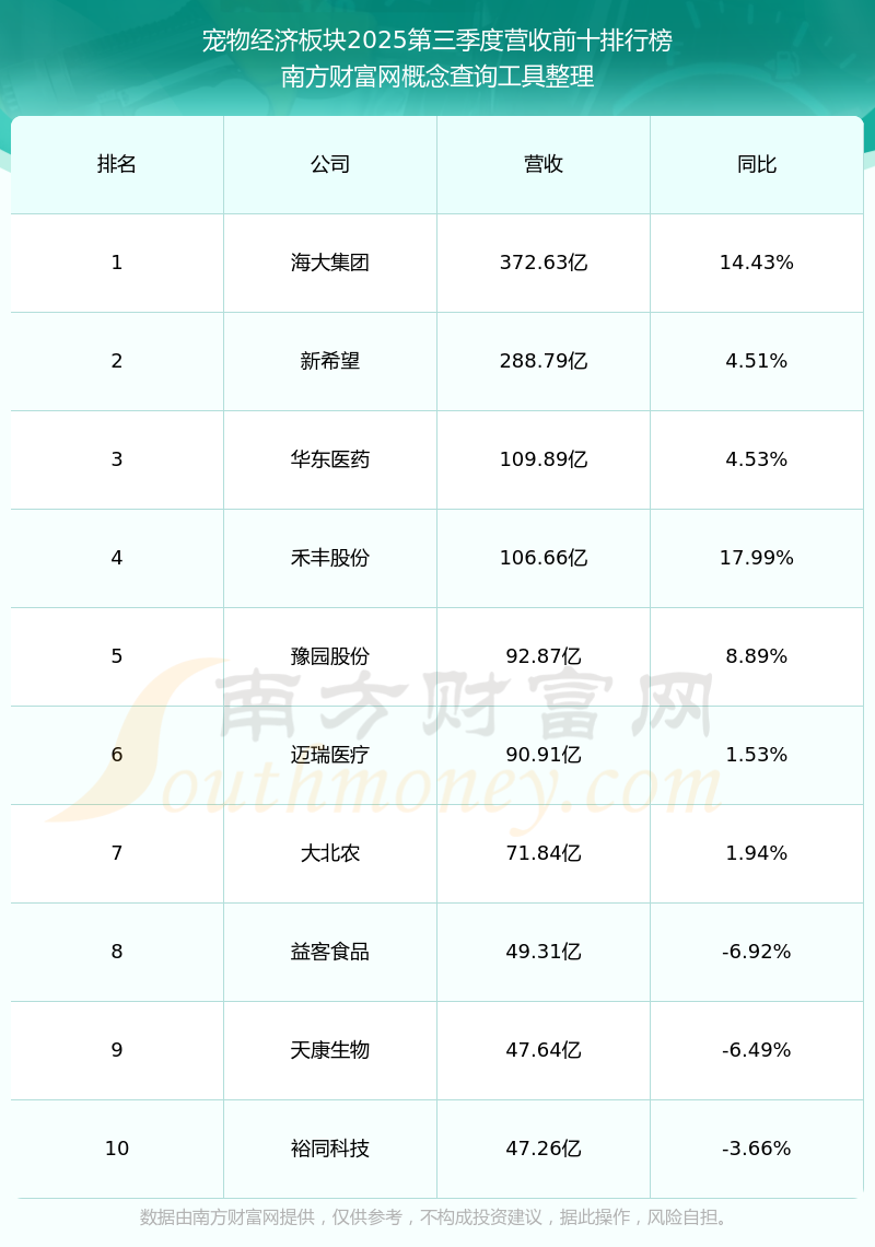 按照南方財(cái)富網(wǎng)概念查詢工具統(tǒng)計(jì),該股所屬板塊為寵物經(jīng)濟(jì)板塊,該板塊共有118只股票,中牧股份2025第三季度營(yíng)收在該板塊中排名為第25名,該板塊2025第三季度營(yíng)收排名前十的股票如下表:
