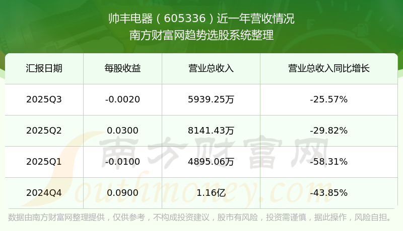 帥豐電器發(fā)布2025年第三季度財報。實現(xiàn)總營收5939.25萬元,同比增長-25.57%;扣非凈利潤同比增長-272.02%至-198.06萬元。