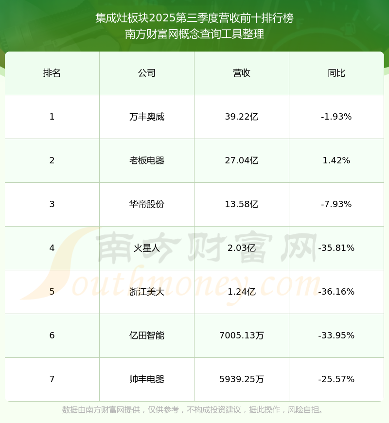 按照南方財富網(wǎng)概念查詢工具統(tǒng)計,該股所屬板塊為集成灶板塊,該板塊共有7只股票,帥豐電器2025第三季度營收在該板塊中排名為第7名,該板塊2025第三季度營收排名前十的股票如下表: