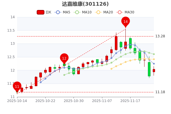 11月11日消息,達(dá)嘉維康5日內(nèi)股價(jià)下跌5.07%,最新報(bào)12.040元,成交量479.04萬手,總市值為24.73億元。