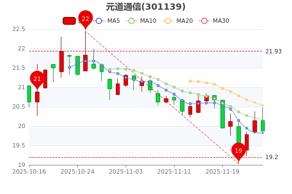 11月26日股市消息,元道通信(301139)收盤報(bào)19.870元/股,跌1.34%。公司股價(jià)沖高至20.49元,最低達(dá)19.86元,換手率3.67%。