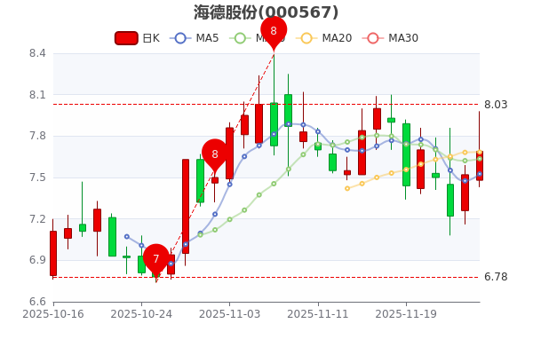 10月31日收盤消息,海德股份最新報(bào)7.690元,漲2.73%。成交量5524.42萬(wàn)手,總市值為150.31億元。