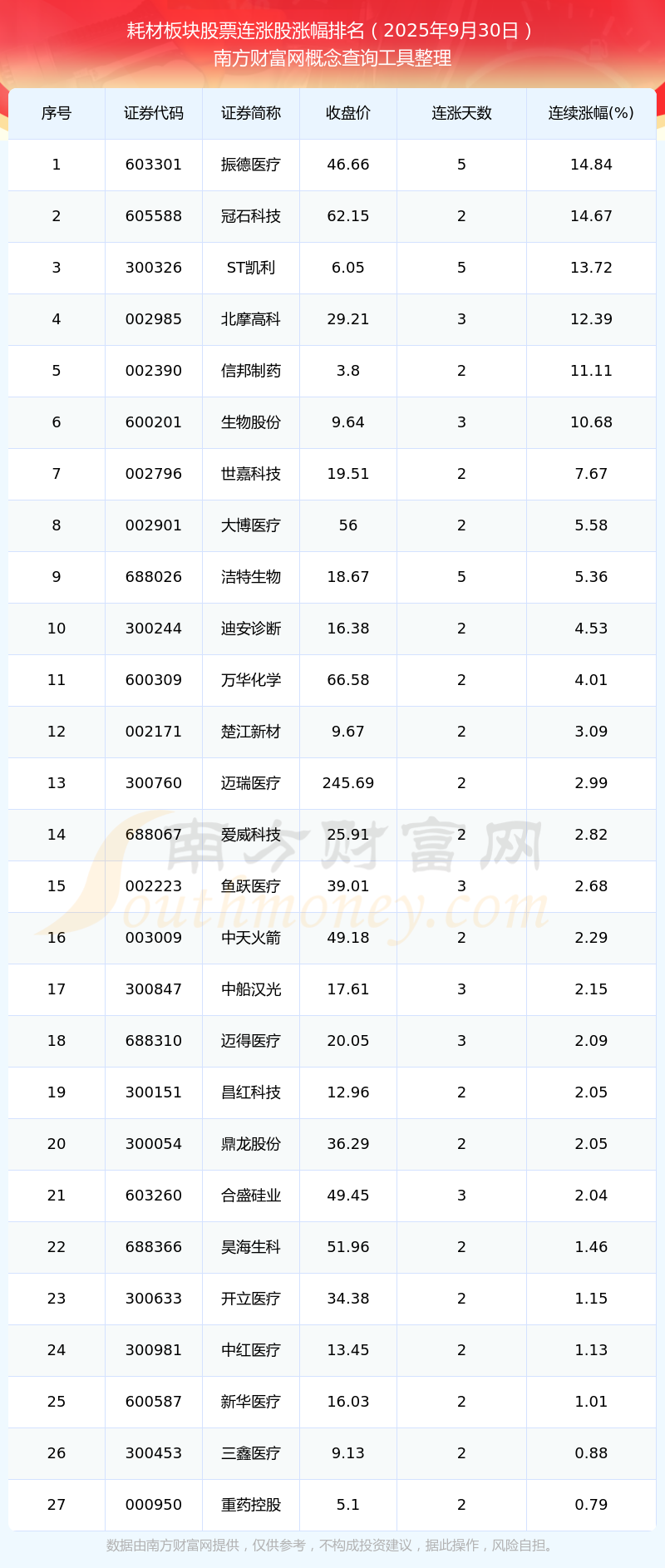 2025年9月30日耗材板塊股票連漲股漲幅排名