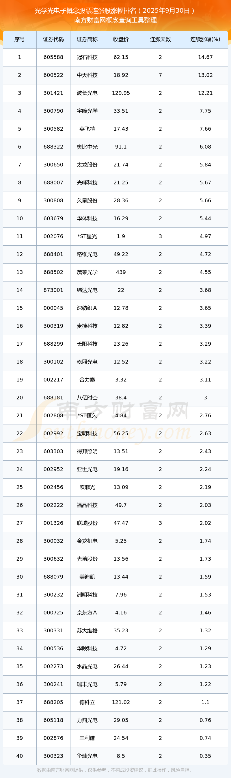 2025年9月30日光學光電子概念股票連漲股漲幅排名