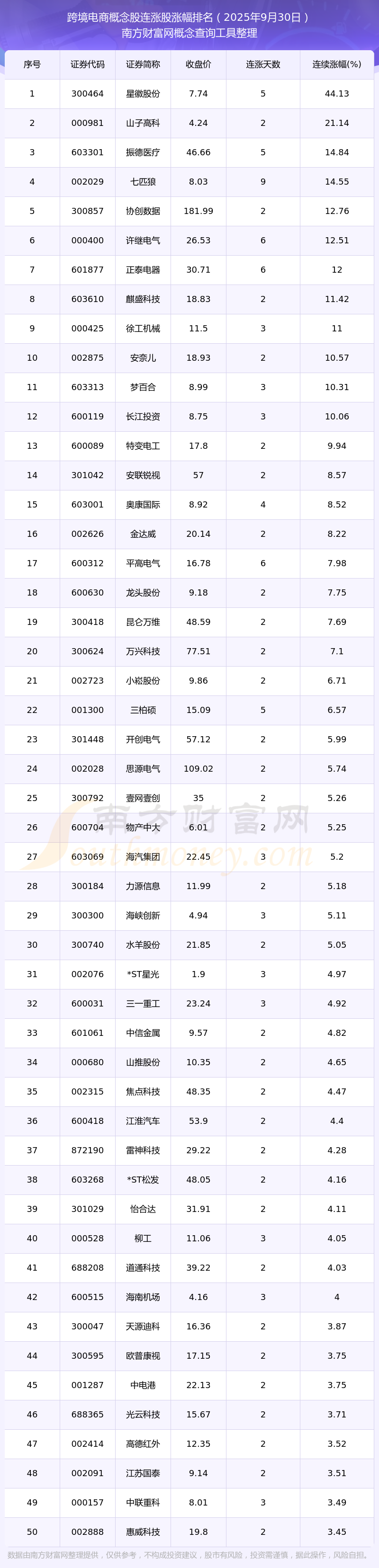 2025年9月30日跨境電商概念股連漲股漲幅排名