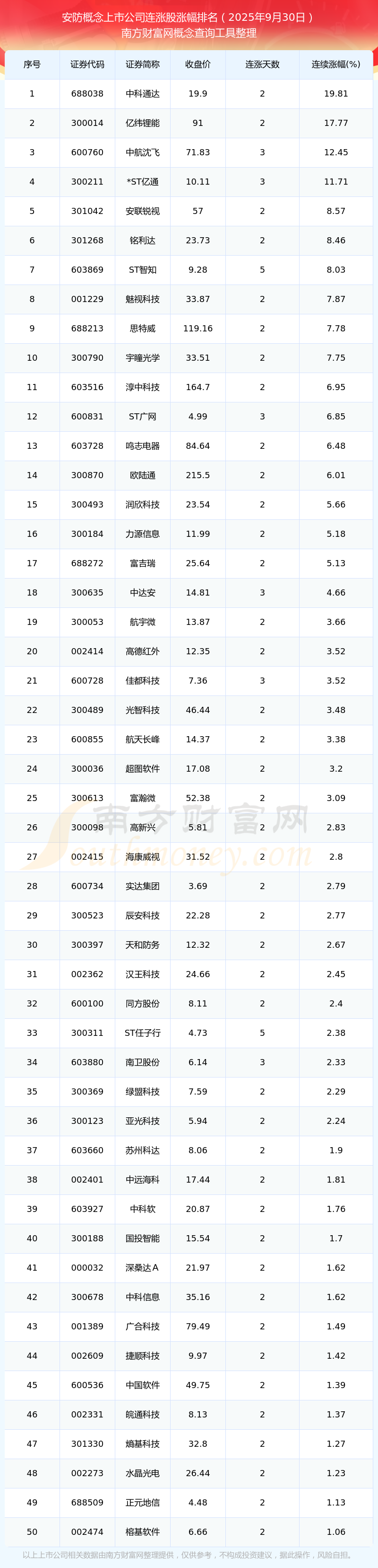 根據(jù)南方財(cái)富網(wǎng)概念查詢工具數(shù)據(jù)統(tǒng)計(jì),截止2025年9月30日收盤(pán),安防概念上市公司共有56只個(gè)股實(shí)現(xiàn)連漲。其中連續(xù)漲幅較大的個(gè)股有中科通達(dá)、億緯鋰能、中航沈飛等,連續(xù)漲幅分別為19.81%、17.77%、12.45%。