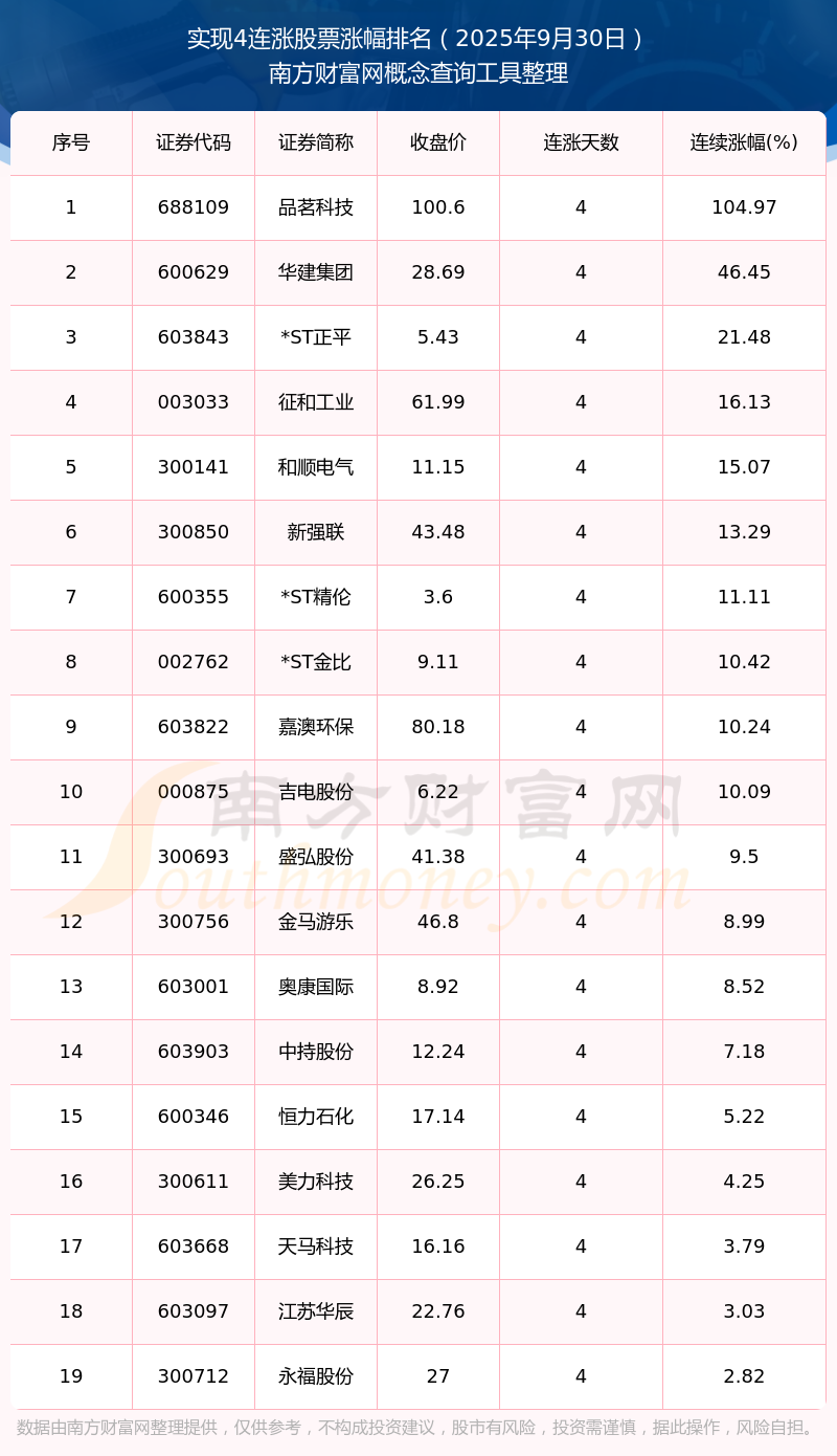 2025年9月30日實(shí)現(xiàn)4連漲股票漲幅排名