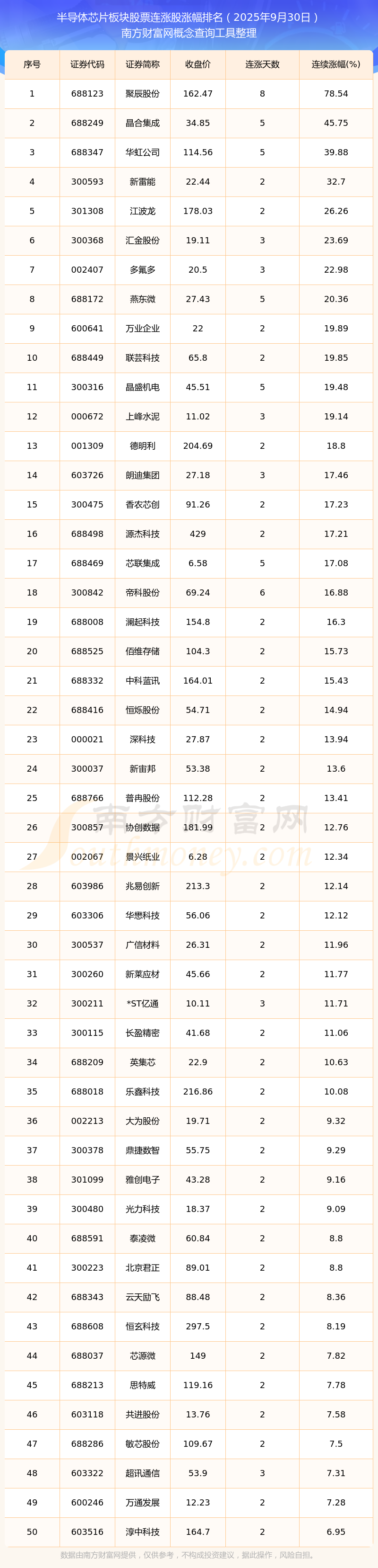 2025年9月30日半導(dǎo)體芯片板塊股票連漲股漲幅排名