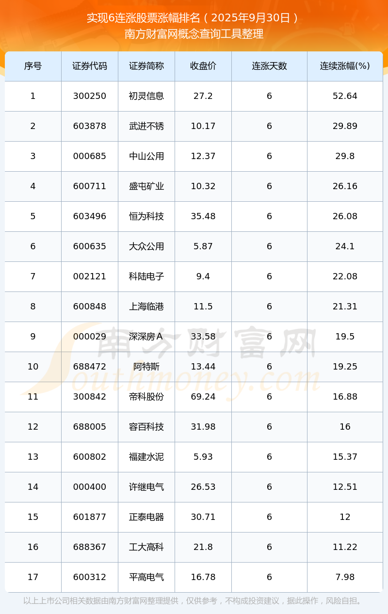 根據(jù)南方財(cái)富網(wǎng)概念查詢工具數(shù)據(jù)統(tǒng)計(jì),截止2025年9月30日收盤,共有17只個(gè)股實(shí)現(xiàn)6天連漲。其中連續(xù)漲幅較大的個(gè)股有初靈信息、武進(jìn)不銹、中山公用等,連續(xù)漲幅分別為52.64%、29.89%、29.80%。