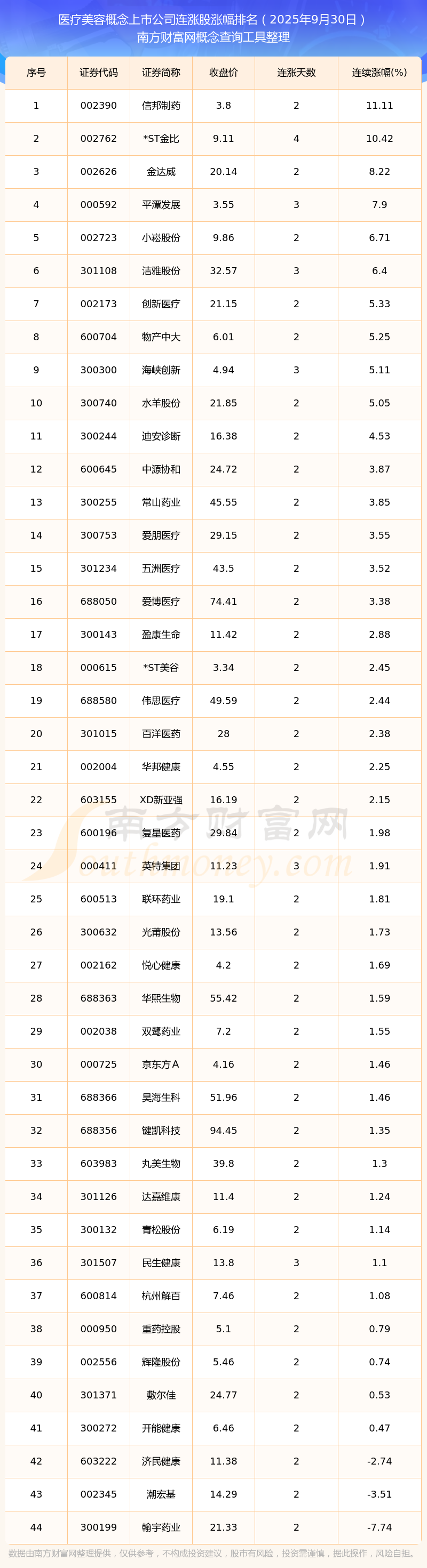 2025年9月30日醫(yī)療美容概念上市公司連漲股漲幅排名