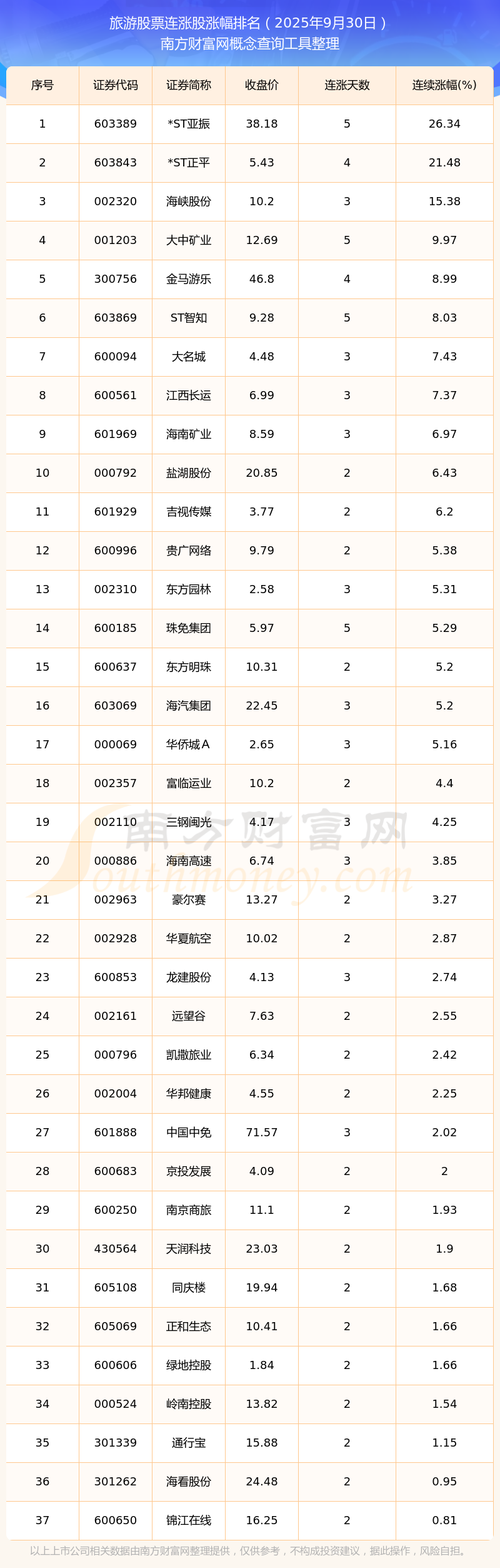 根據(jù)南方財(cái)富網(wǎng)概念查詢工具數(shù)據(jù)統(tǒng)計(jì),截止2025年9月30日收盤,旅游股票共有37只個(gè)股實(shí)現(xiàn)連漲。其中連續(xù)漲幅較大的個(gè)股有*ST亞振、*ST正平、海峽股份等,連續(xù)漲幅分別為26.34%、21.48%、15.38%。