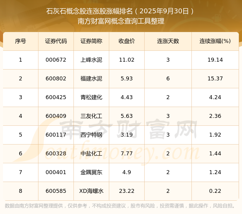 根據(jù)南方財富網(wǎng)概念查詢工具數(shù)據(jù)統(tǒng)計,截止2025年9月30日收盤,石灰石概念股共有8只個股實現(xiàn)連漲。其中連續(xù)漲幅較大的個股有上峰水泥、福建水泥、青松建化等,連續(xù)漲幅分別為19.14%、15.37%、4.24%。