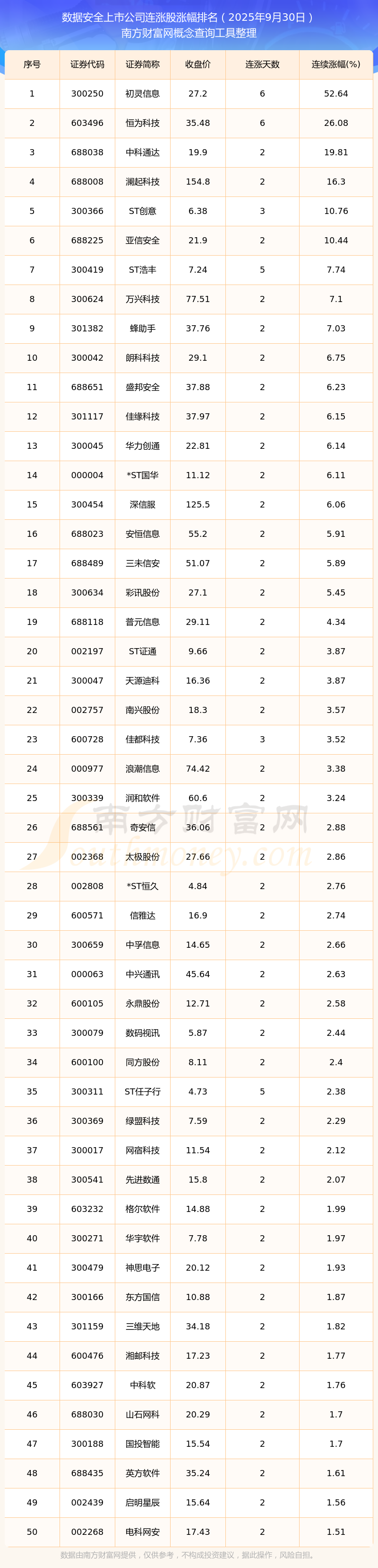 2025年9月30日數(shù)據(jù)安全上市公司連漲股漲幅排名