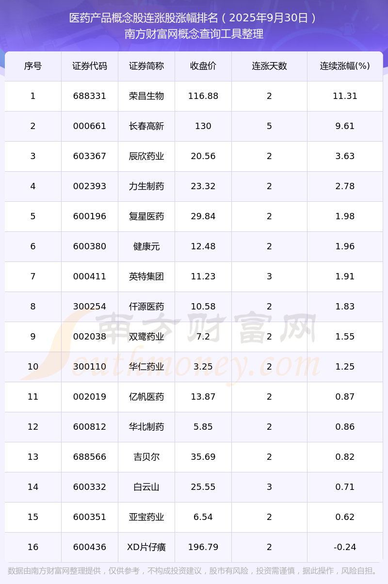 2025年9月30日醫(yī)藥產(chǎn)品概念股連漲股漲幅排名