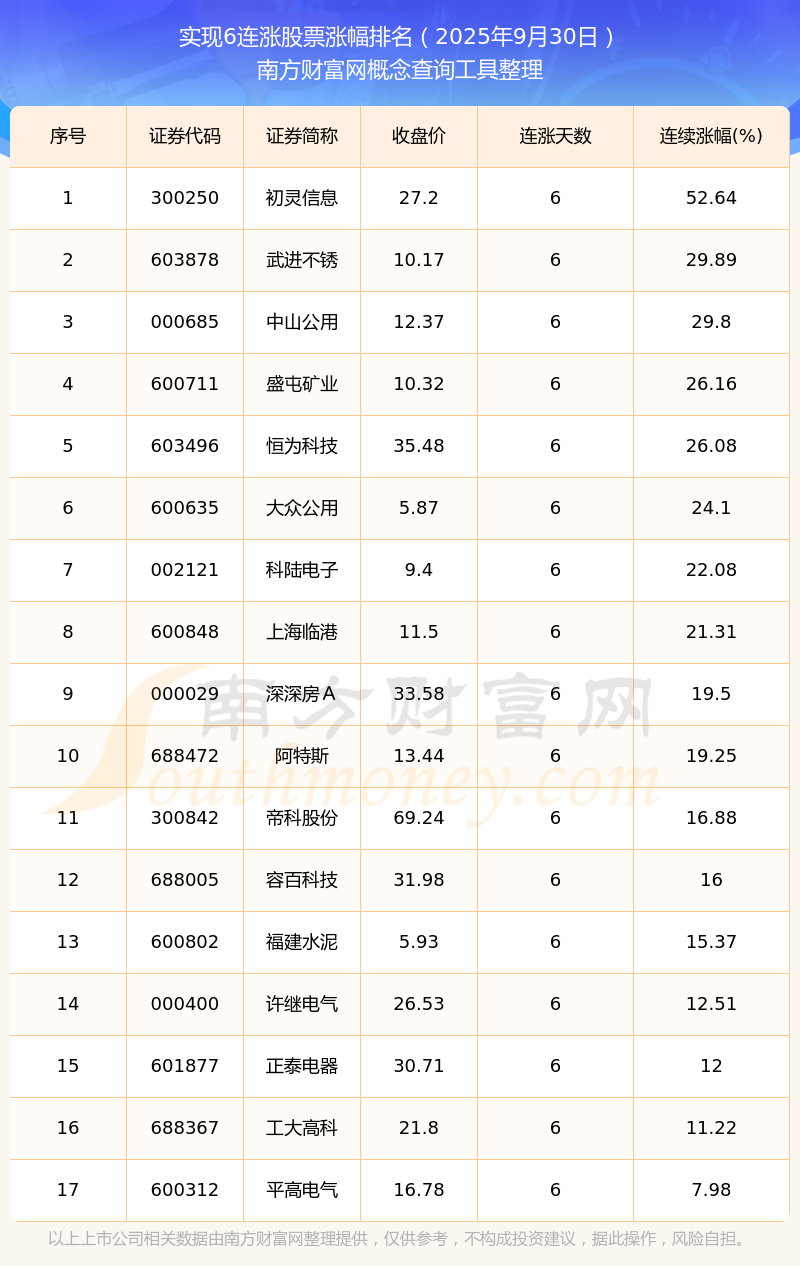 2025年9月30日實現(xiàn)6連漲股票漲幅排名