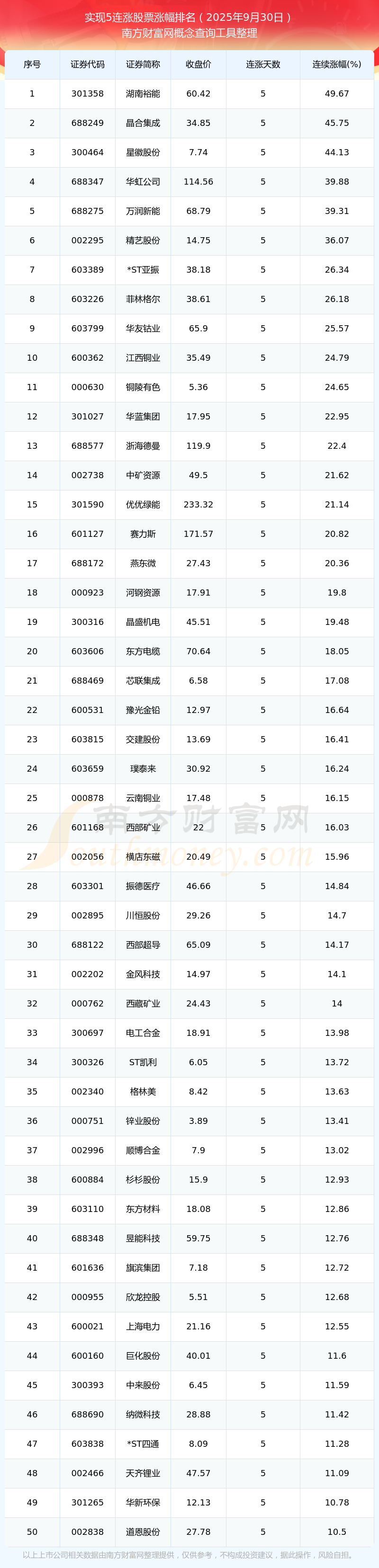 根據(jù)南方財富網(wǎng)概念查詢工具數(shù)據(jù)統(tǒng)計,截止2025年9月30日收盤,共有94只個股實現(xiàn)5天連漲。其中連續(xù)漲幅較大的個股有湖南裕能、晶合集成、星徽股份等,連續(xù)漲幅分別為49.67%、45.75%、44.13%。