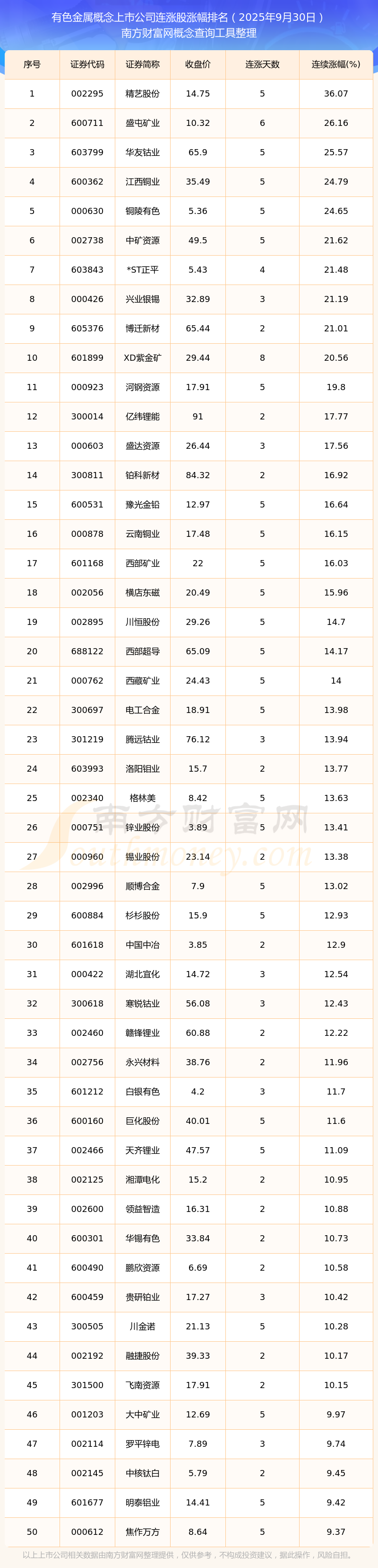 2025年9月30日有色金屬概念上市公司連漲股票漲幅排名