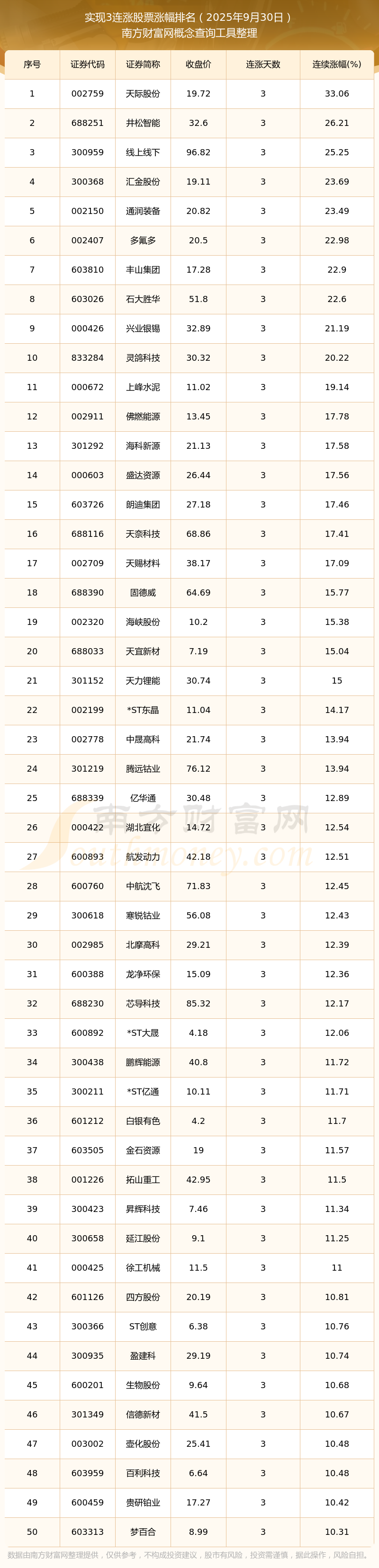 2025年9月30日實(shí)現(xiàn)3連漲股票漲幅排名