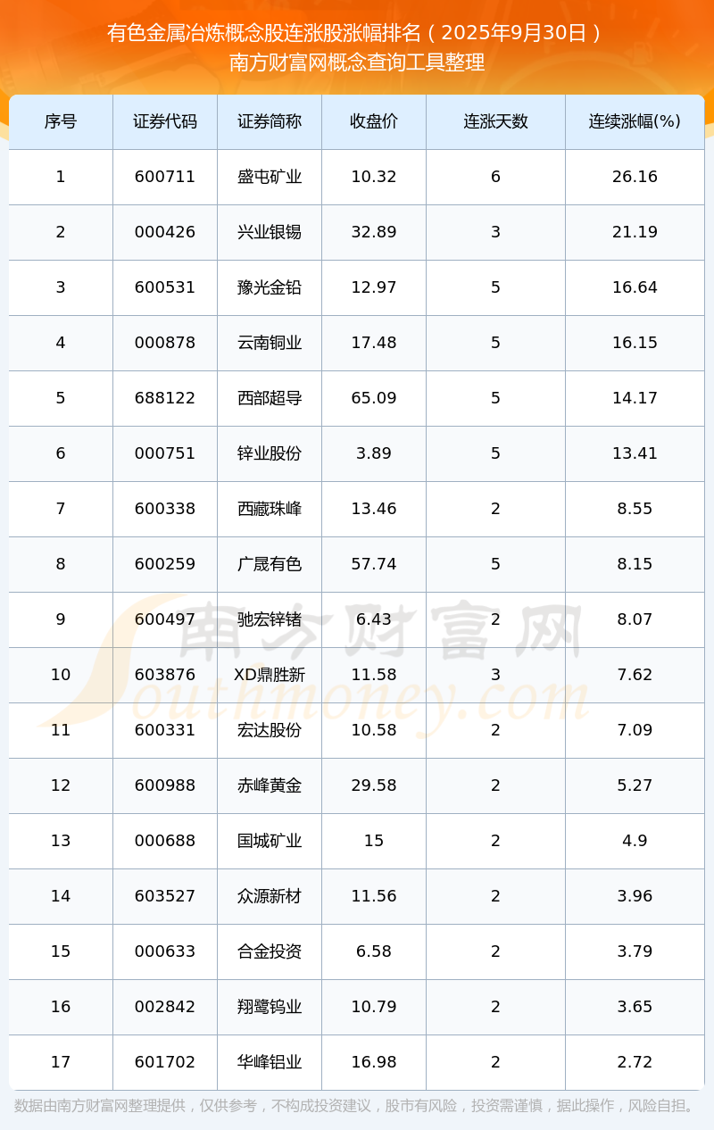 2025年9月30日有色金屬冶煉概念股連漲股漲幅排名