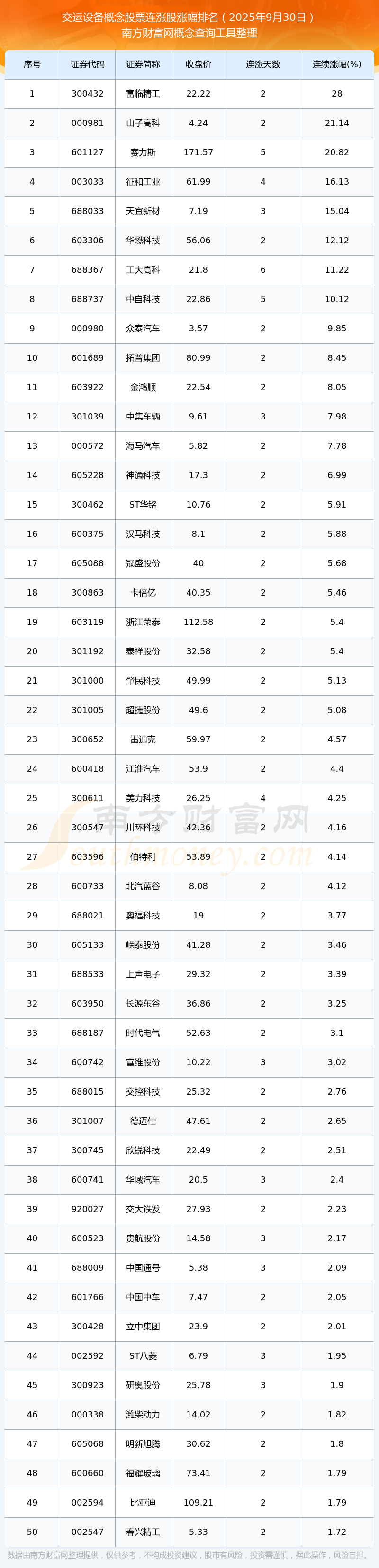 根據(jù)南方財(cái)富網(wǎng)概念查詢工具數(shù)據(jù)統(tǒng)計(jì),截止2025年9月30日收盤,交運(yùn)設(shè)備概念股票共有66只個(gè)股實(shí)現(xiàn)連漲。其中連續(xù)漲幅較大的個(gè)股有富臨精工、山子高科、賽力斯等,連續(xù)漲幅分別為28.00%、21.14%、20.82%。