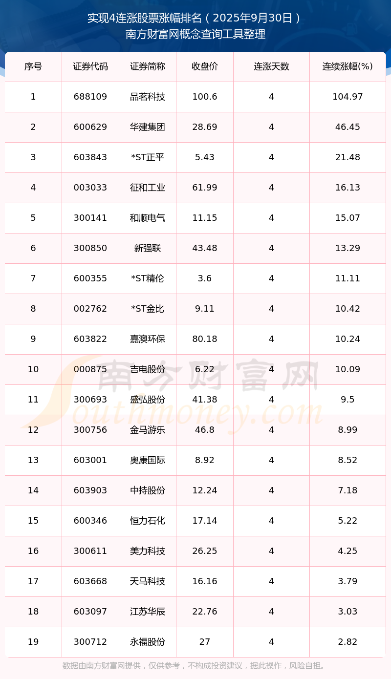 2025年9月30日實現(xiàn)4連漲股票漲幅排名
