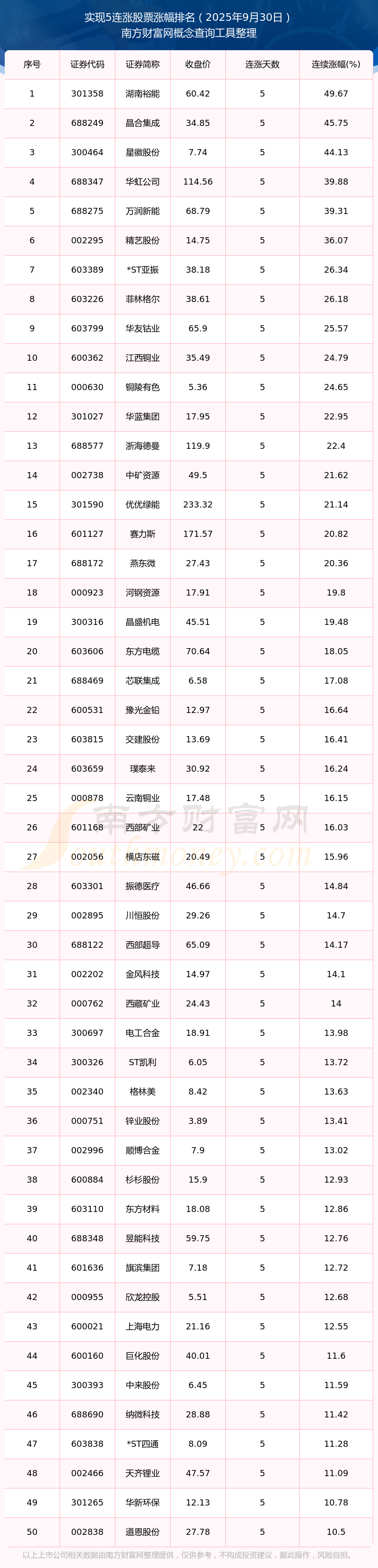 2025年9月30日實(shí)現(xiàn)5連漲股票漲幅排名