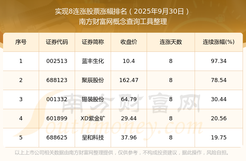 2025年9月30日實(shí)現(xiàn)8連漲股票漲幅排名