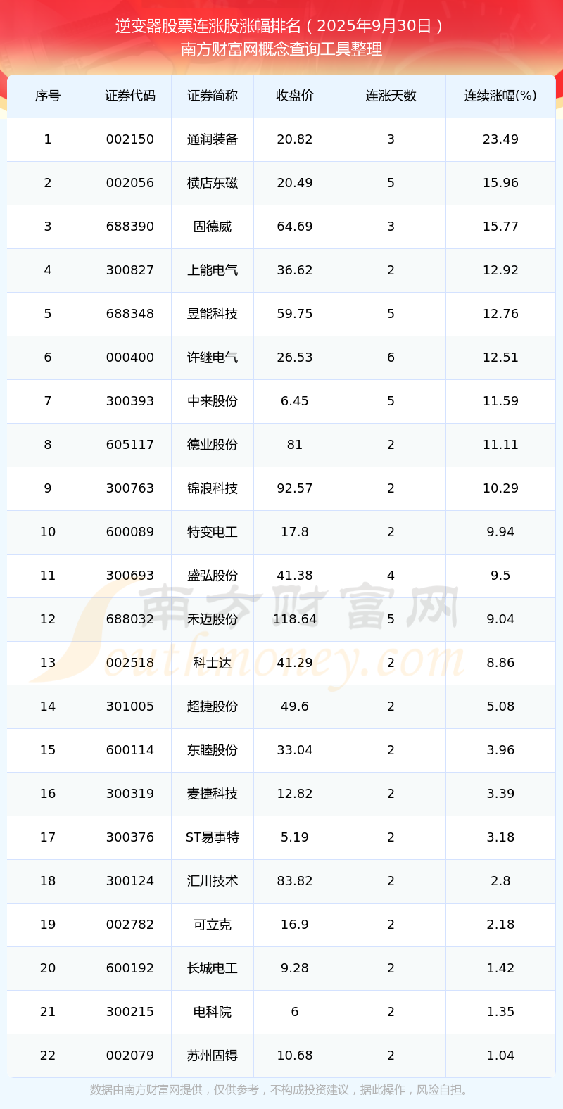 根據(jù)南方財(cái)富網(wǎng)概念查詢工具數(shù)據(jù)統(tǒng)計(jì),截止2025年9月30日收盤(pán),逆變器股票共有22只個(gè)股實(shí)現(xiàn)連漲。其中連續(xù)漲幅較大的個(gè)股有通潤(rùn)裝備、橫店?yáng)|磁、固德威等,連續(xù)漲幅分別為23.49%、15.96%、15.77%。