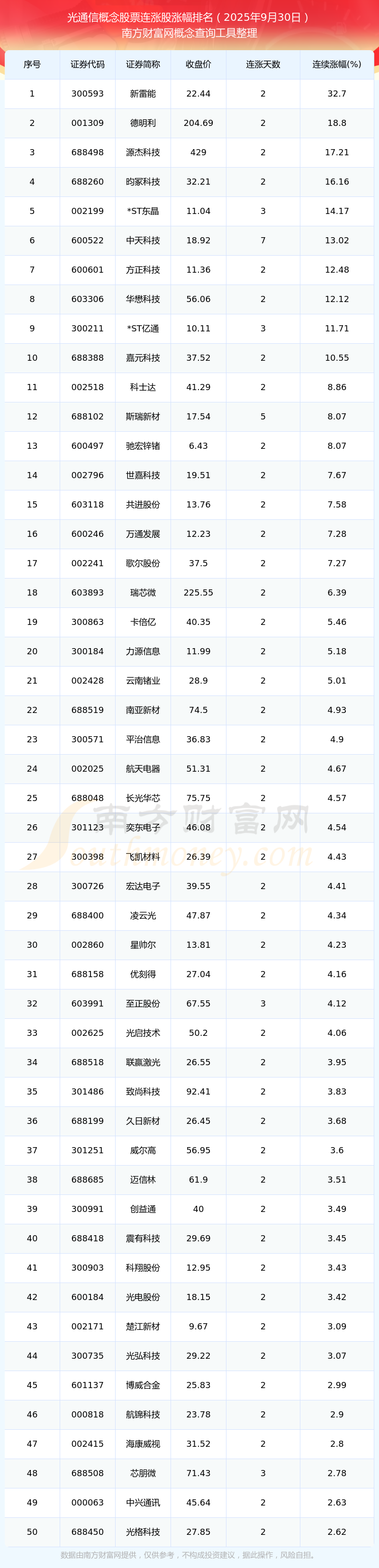 2025年9月30日光通信概念股票連漲股漲幅排名