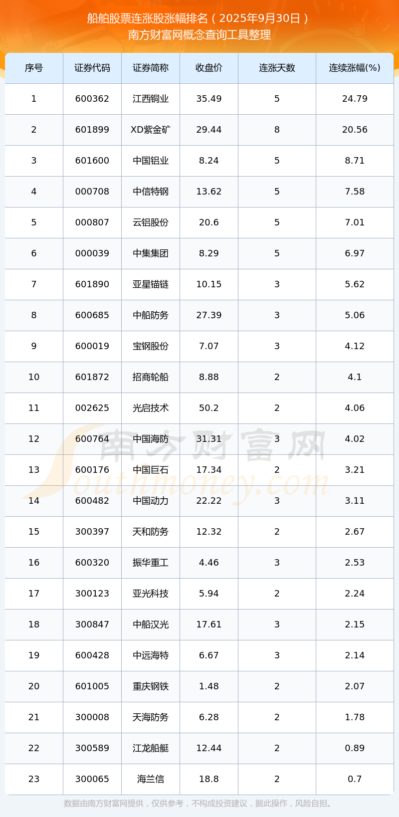 根據(jù)南方財(cái)富網(wǎng)概念查詢工具數(shù)據(jù)統(tǒng)計(jì),截止2025年9月30日收盤,船舶股票共有23只個(gè)股實(shí)現(xiàn)連漲。其中連續(xù)漲幅較大的個(gè)股有江西銅業(yè)、XD紫金礦、中國鋁業(yè)等,連續(xù)漲幅分別為24.79%、20.56%、8.71%。