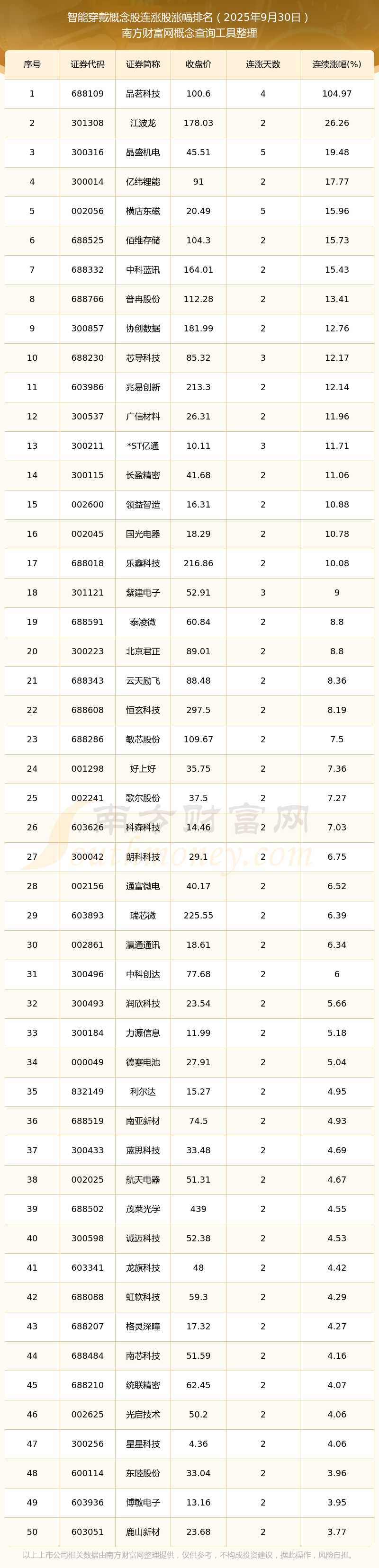 根據(jù)南方財富網概念查詢工具數(shù)據(jù)統(tǒng)計,截止2025年9月30日收盤,智能穿戴概念股共有102只個股實現(xiàn)連漲。其中連續(xù)漲幅較大的個股有品茗科技、江波龍、晶盛機電等,連續(xù)漲幅分別為104.97%、26.26%、19.48%。